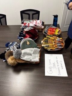 In Bonnyville, at our Lakeland Employment Services office, we had a coffee break-themed drop-in – a chance for people to mingle and have some coffee and snacks. We connected with the folks from the Fetal Alcohol Spectrum Disorder (FASD) Society, Community Futures, The Hive Youth Hub, and a client. We played information videos on the projector regarding disabilities, and everyone who came went home with their pick of a toque, mittens, or a pair of socks. We donated our leftover snacks and winter items to The Hive and FASD in town.